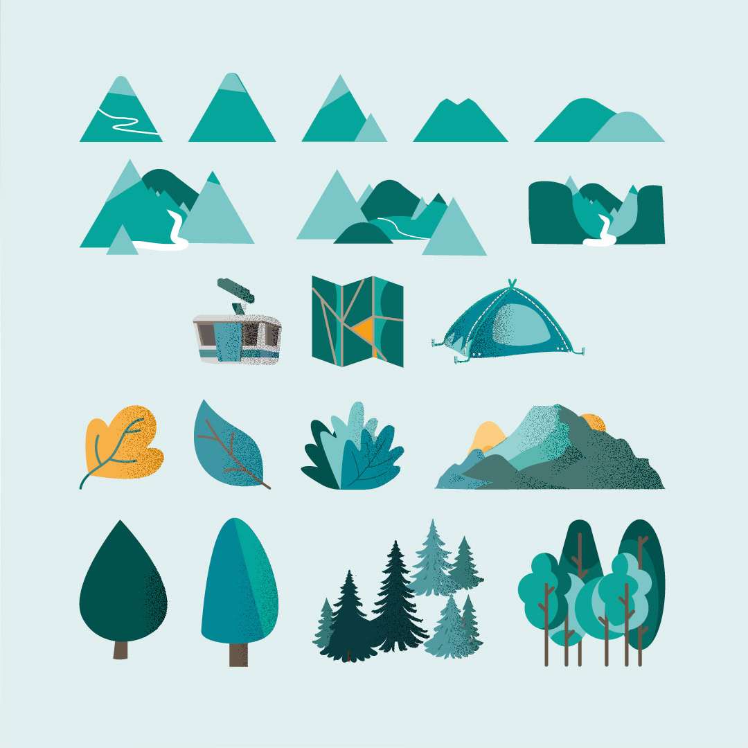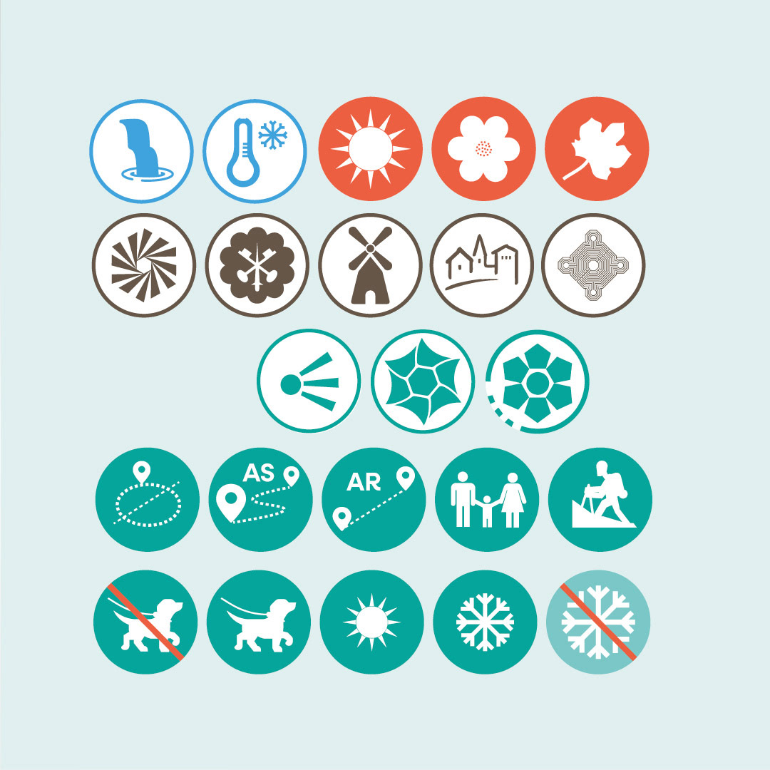Pour enrichir la lecture de la carte et faciliter l’identification des points d’intérêt, une série originale de pictogrammes a été créée. Chaque symbole illustre de façon intuitive les sites remarquables (panoramas, refuges, cascades, burons, châteaux, aires de pique-nique, points d’information, etc.), en tenant compte du vocabulaire graphique des cartes de randonnée tout en y apportant une empreinte identitaire propre au territoire. Le choix des formes, des couleurs et des niveaux de contraste vise à garantir une reconnaissance rapide en conditions réelles.