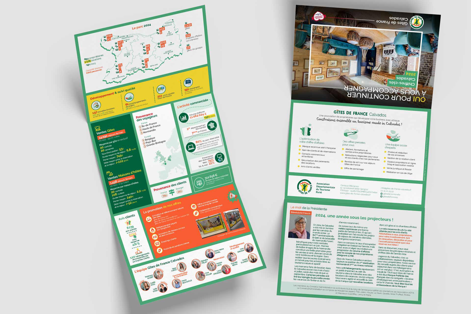 Respecter une charte graphique nationale, celle de Gîtes de France tout en faisant exister l'équipe, les administrateurs et les adhérents du territoire, c'est l’objectif graphique de ces 2 supports qui viennent habiller l'assemblée générale annuelle de l'association Gîtes de France Calvados.